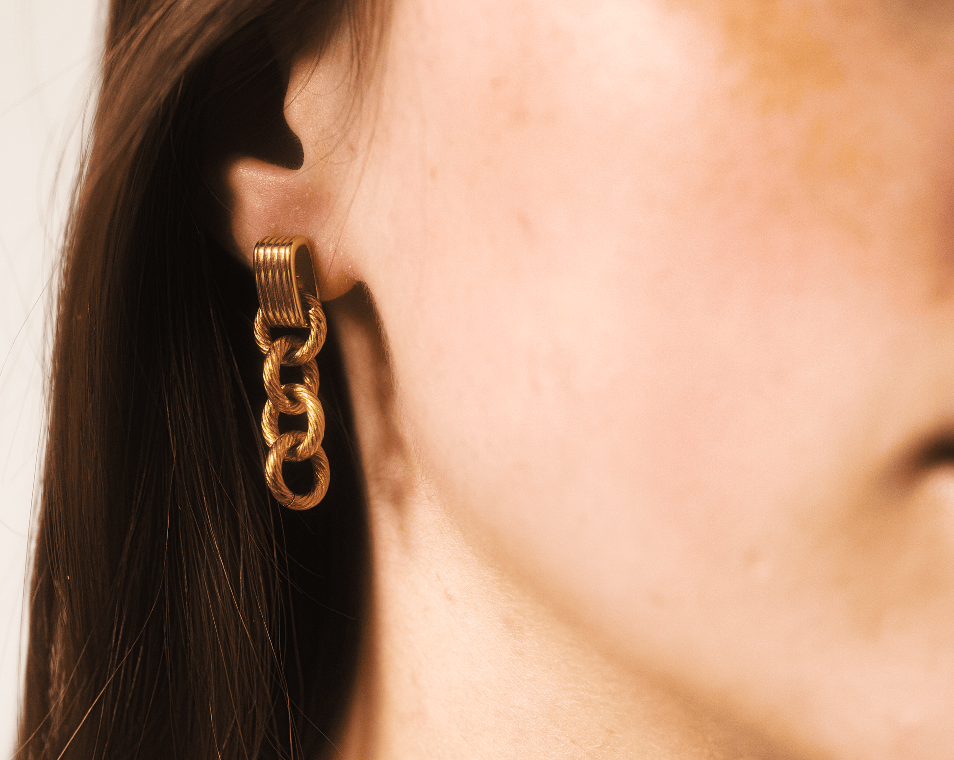Cette paire de boucles d’oreilles est conçue en acier inoxydable doré et assemblée à la main avec amour dans notre atelier en France.