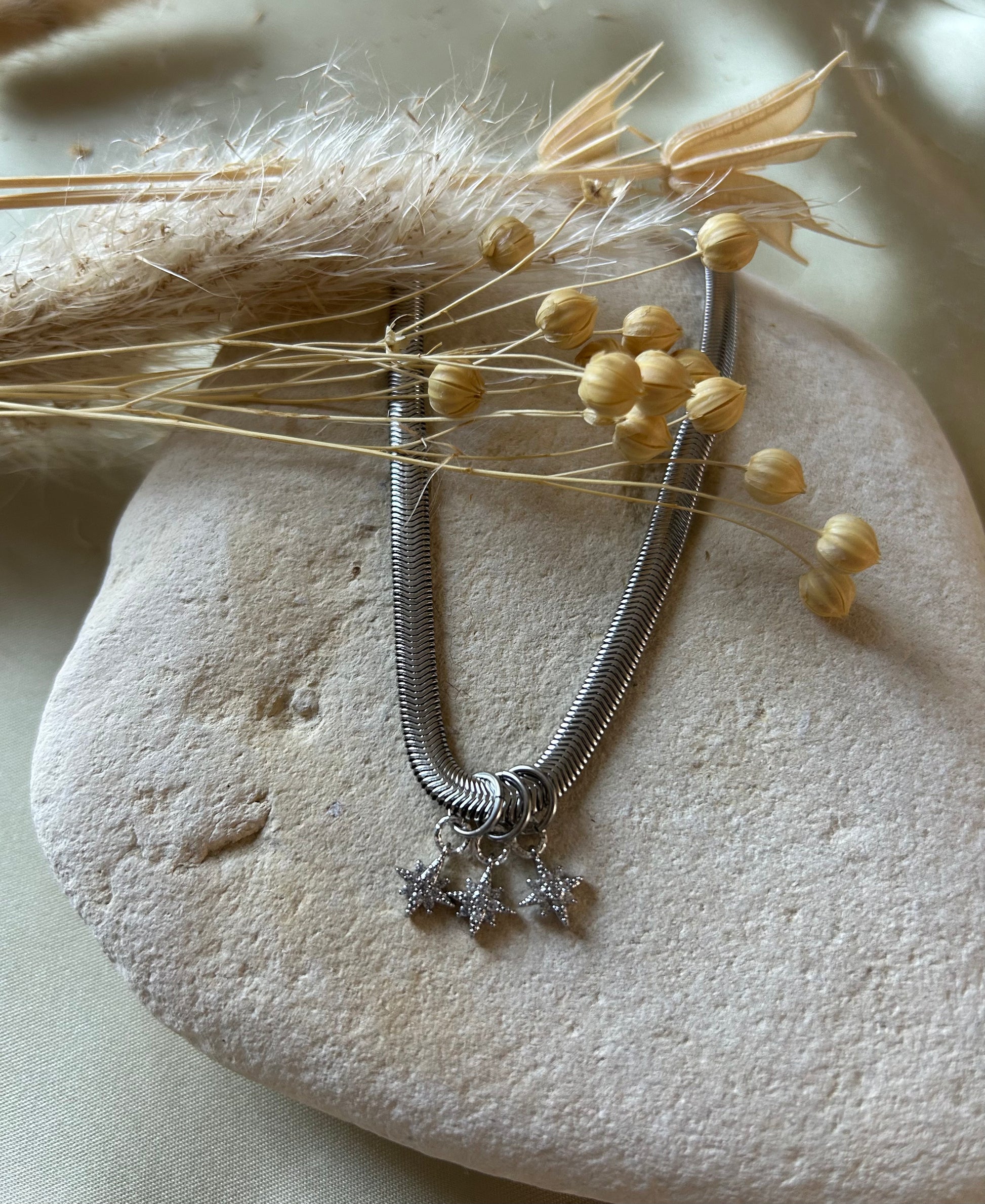 Le collier Clarisse apporte une touche élégante ou rock à votre look, en fonction du nombre de pendentifs que vous choisissez ! Sa maille serpent apporte brillance et style à votre tenue.