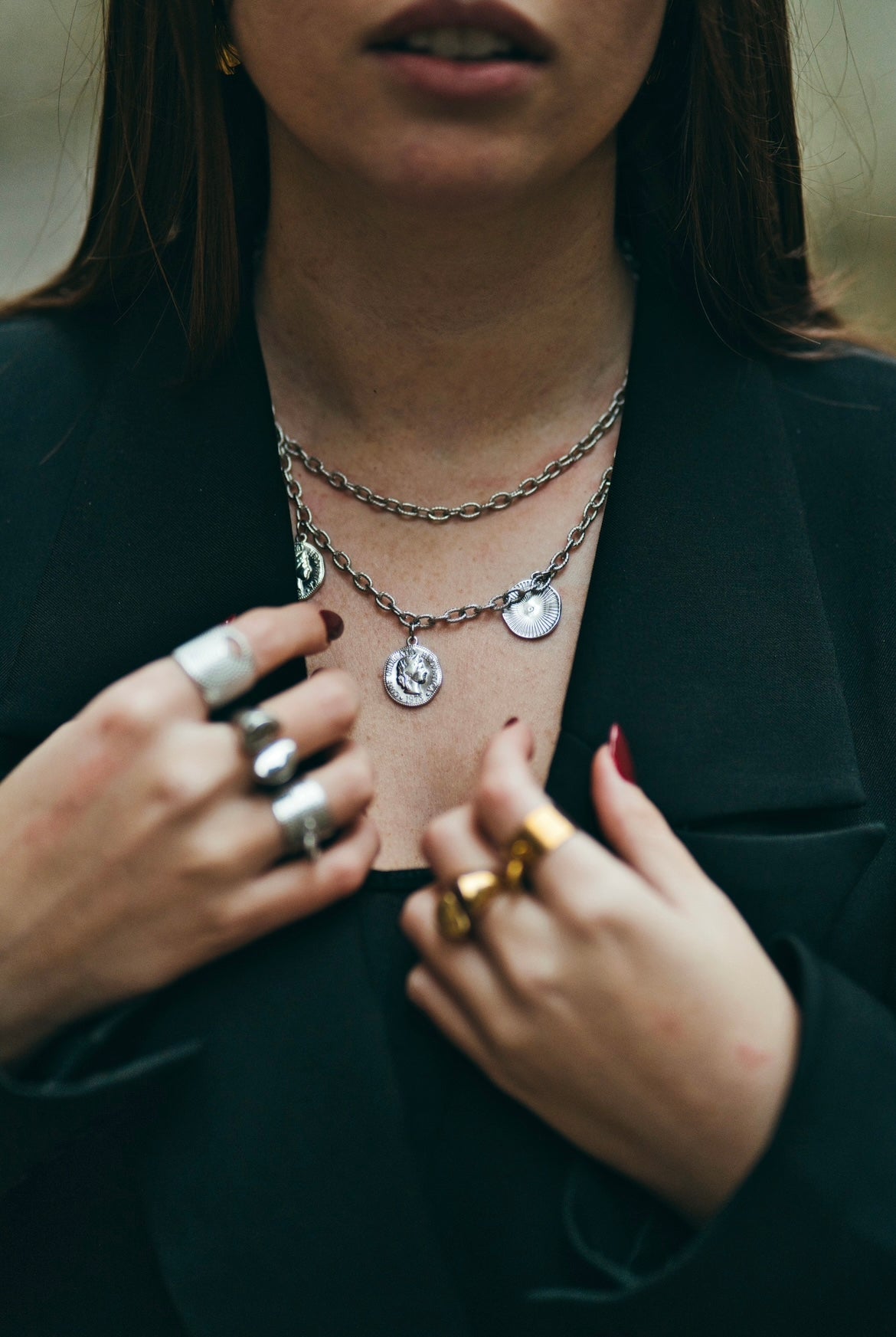 Ce collier double rangs à médaillons est une pièce rock et féminine.